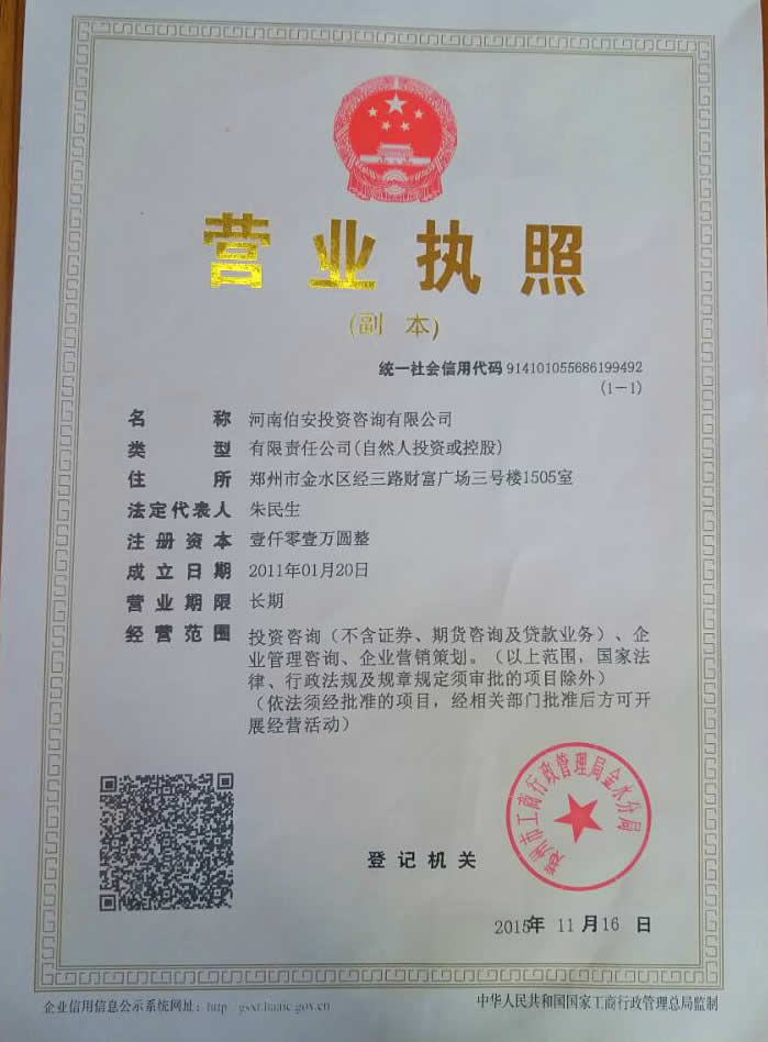 河南伯安投資咨詢有限公司是一家專門面向企業(yè)和個(gè)人提供投融資、客戶理財(cái)、企業(yè)管理、營銷策劃、咨詢等專業(yè)化金融服務(wù)公司。公司本著“誠信為本、專業(yè)領(lǐng)先、 創(chuàng)新服務(wù) 、共贏發(fā)展”的經(jīng)營理念,以“搭建平臺(tái)、 專業(yè)咨詢、 誠信至上、服務(wù)客戶”為服務(wù)宗旨,著力打造高效、專業(yè)的金融服務(wù)平臺(tái)。本公司擁有一支復(fù)合型專業(yè)團(tuán)隊(duì),同時(shí)具有一支專業(yè)化風(fēng)險(xiǎn)管理、企業(yè)策劃、創(chuàng)意設(shè)計(jì)…......
